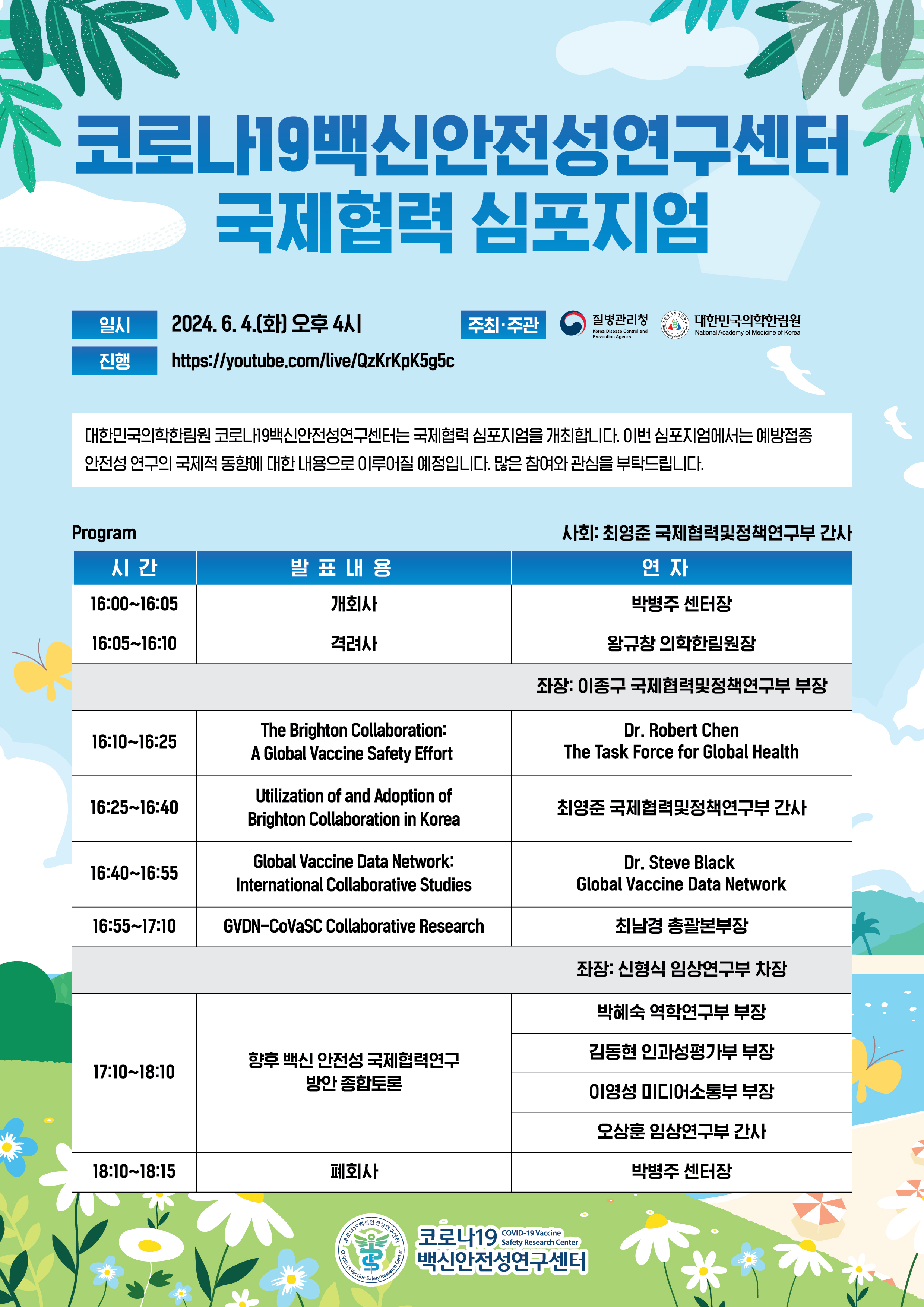 코로나19백신안전성연구센터에서 2024년 06월 04일 오후 4시에 국제협력 심포지엄을 개최합니다.
